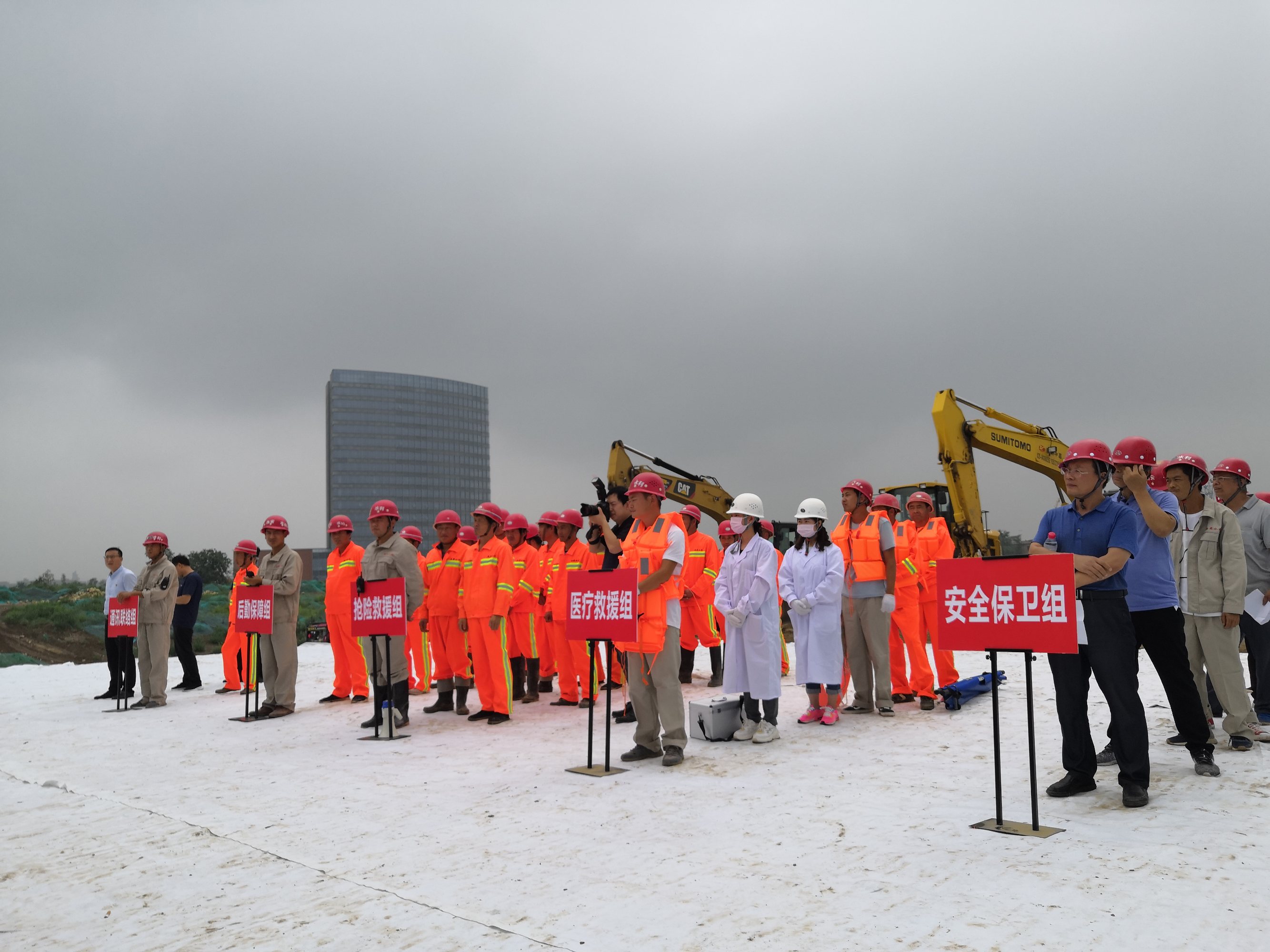 搶險救援組趕赴現場對圍堰缺口進行機械圍堵、沙袋防護、水泵抽水等搶險行動,模擬搶險過程中,有一工人不慎落水,醫療救援組對該落水工人進行了緊急救援,并送至醫院救治。各小組協同作戰,使防汛搶險任務順利完成,讓工程受災損失降到最低。